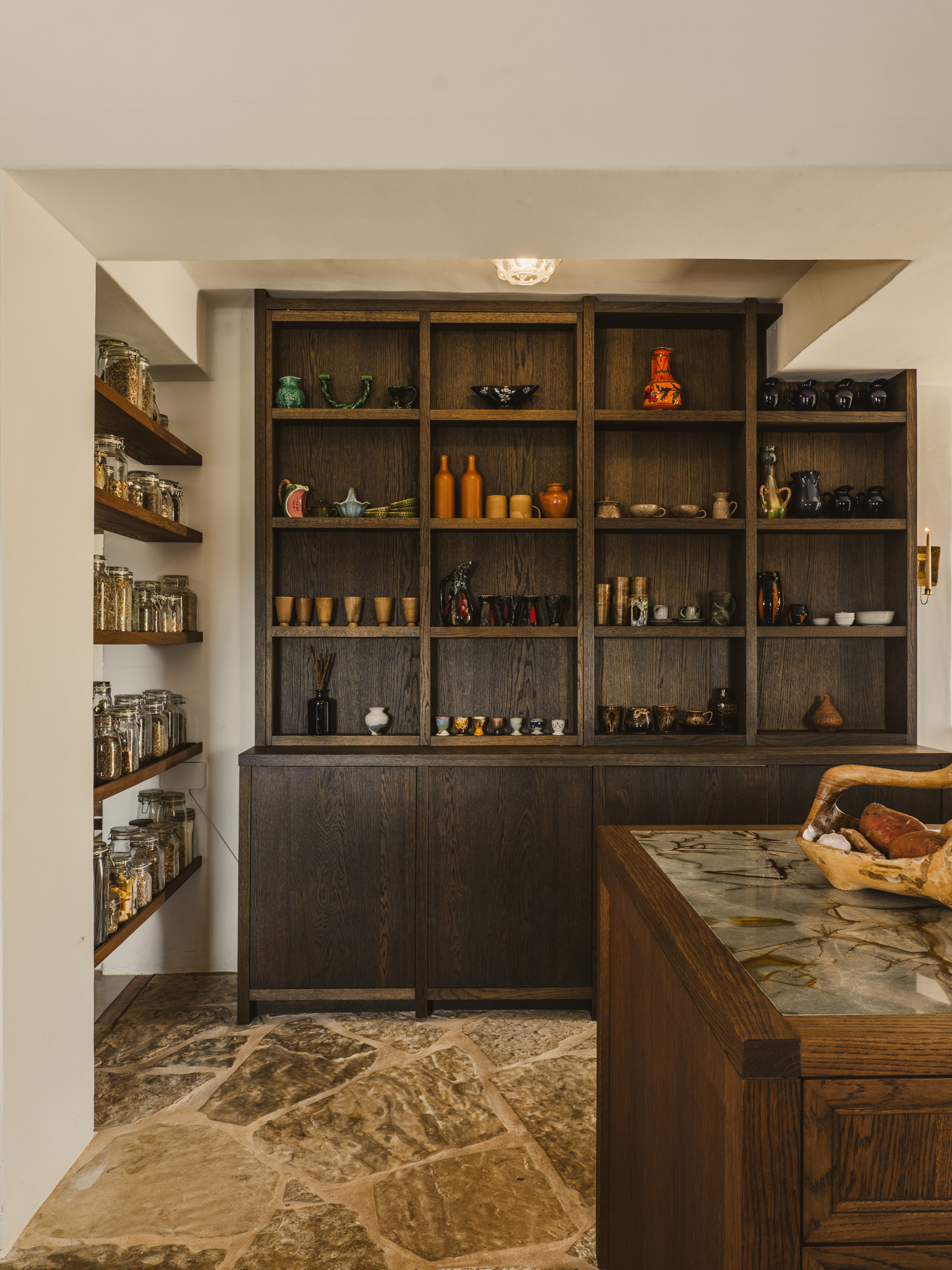 A kitchen project in Ibiza defined by raw elegance and honest materials, a dialogue between structure and landscape, shaped by the island’s elemental character. A family kitchen where weathered steel meets natural wood, a composition of tone and texture that evokes a grounded, elemental atmosphere. The wooden elements of the house are echoed in the ceiling, while the beautiful stone floor retains its original presence. Gold-toned details bring a subtle touch of warmth and refinement of the space. For this Ibiza project, the kitchen aesthetic flows seamlessly through the interior, with custom cabinetry echoing the material language and tone of space. Ample storage is integrated with wooden beams, and the interior of the cabinetry is fully aligned with the style and feeling of the kitchen.