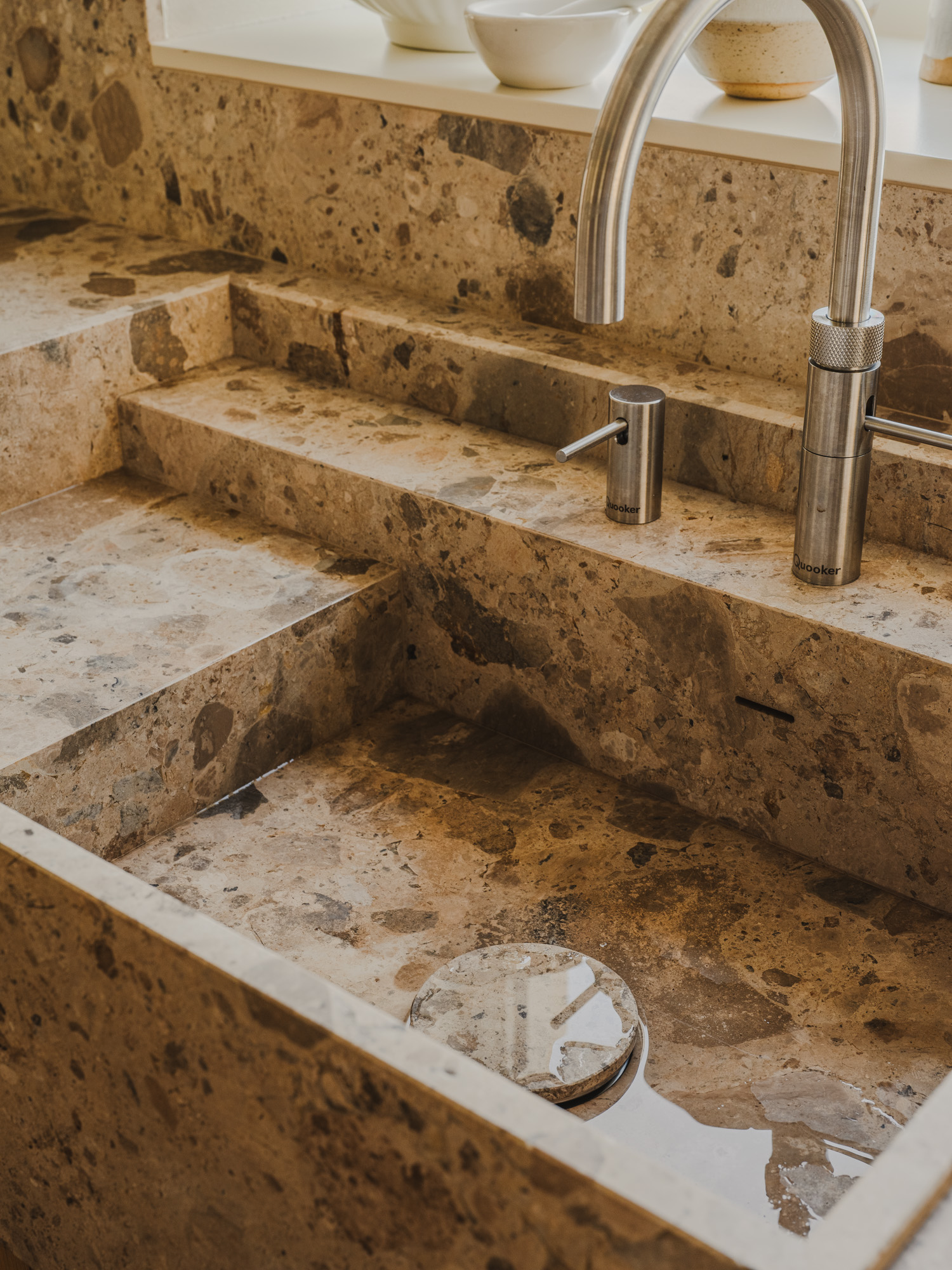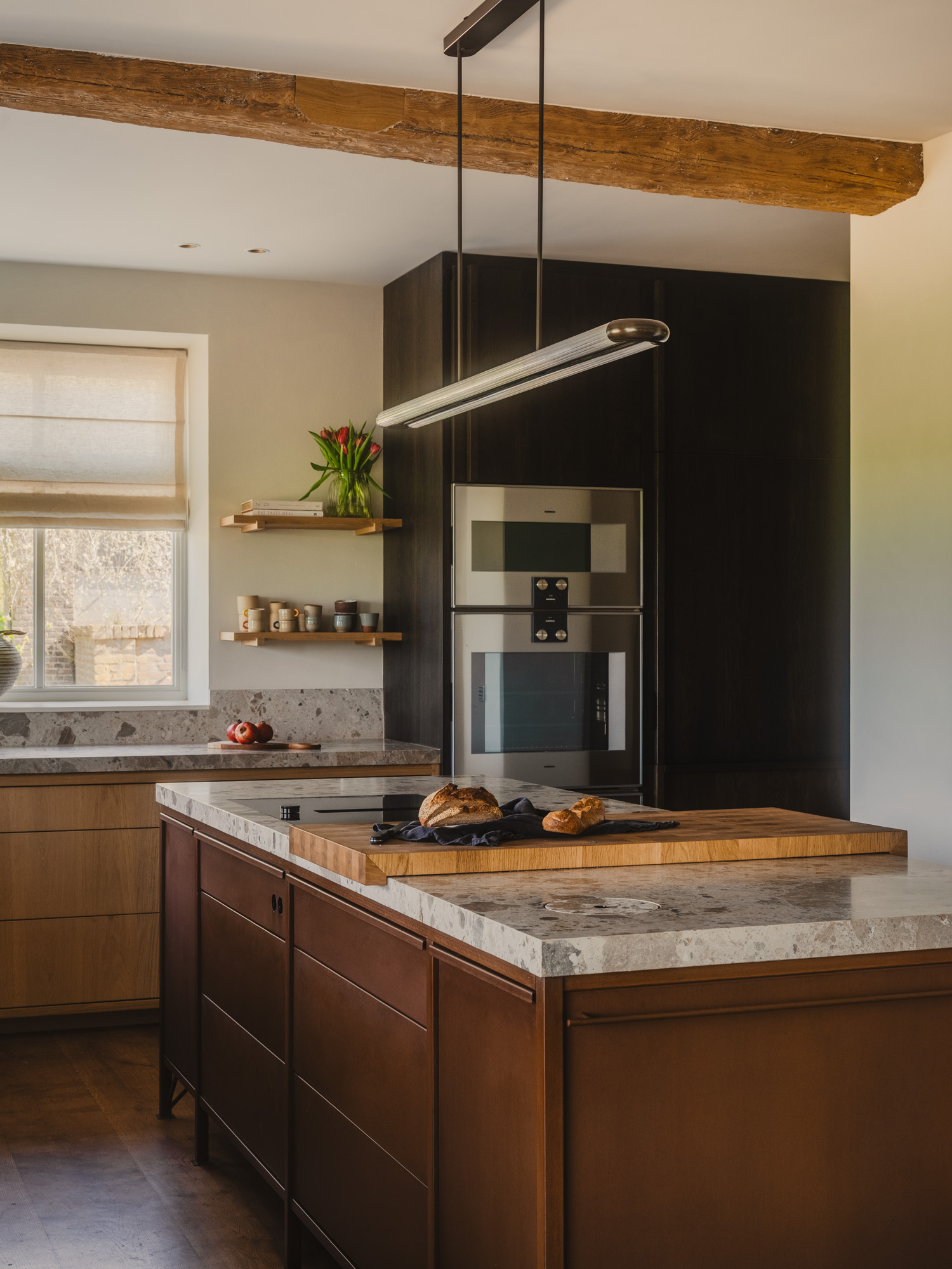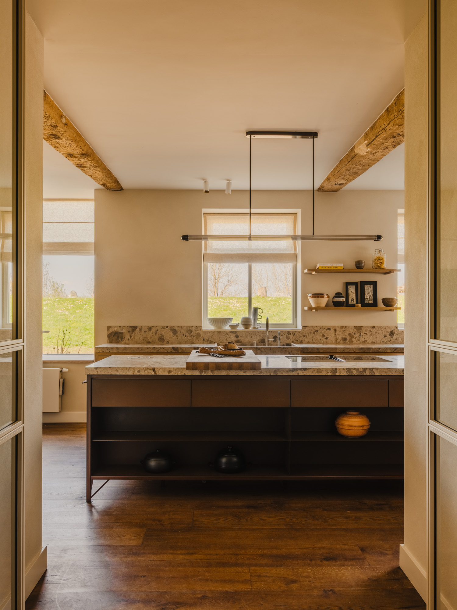 With varied wood textures, a centered marble sink and gentle daylight, this kitchen finds harmony in rural inspiration.