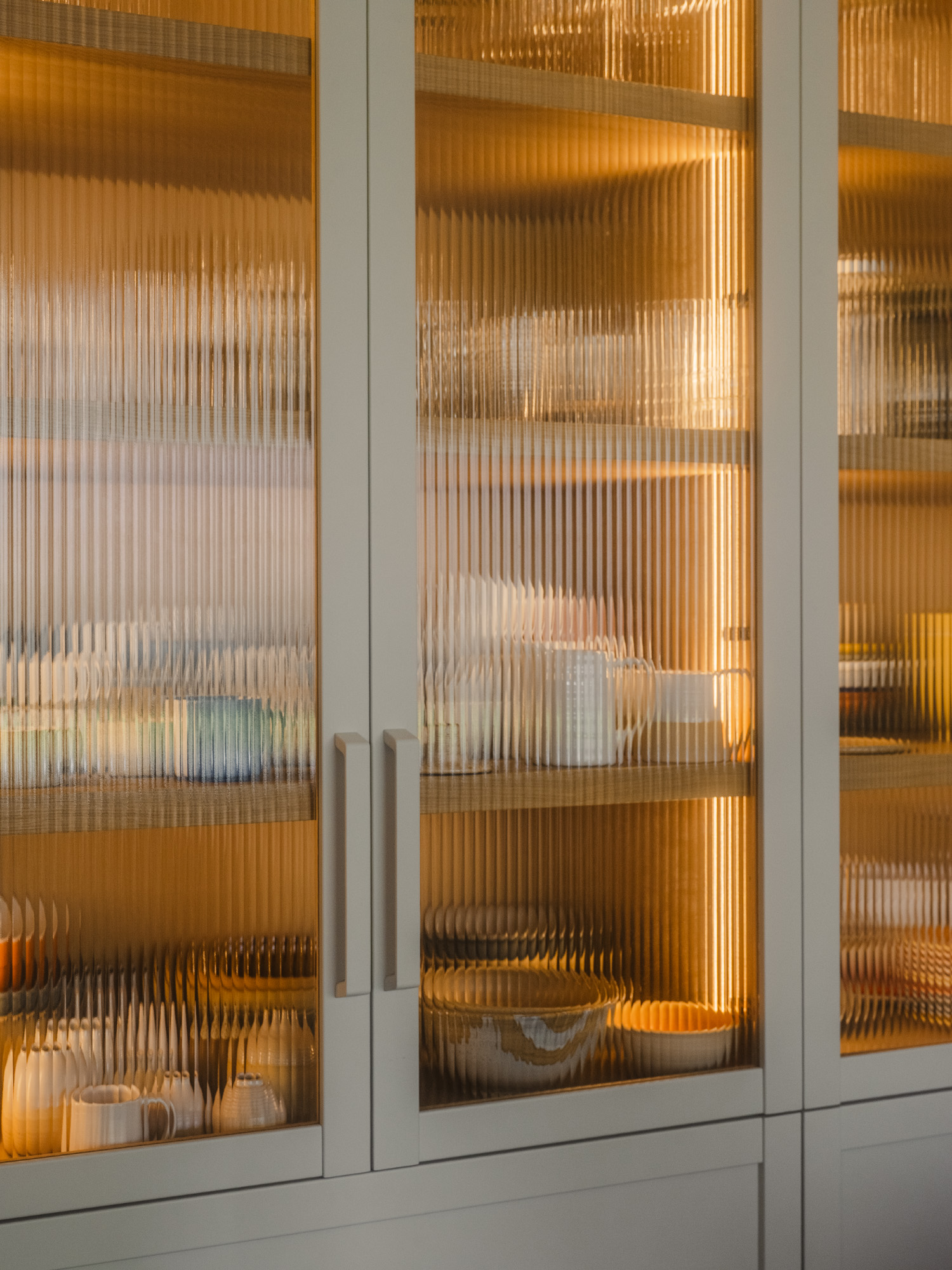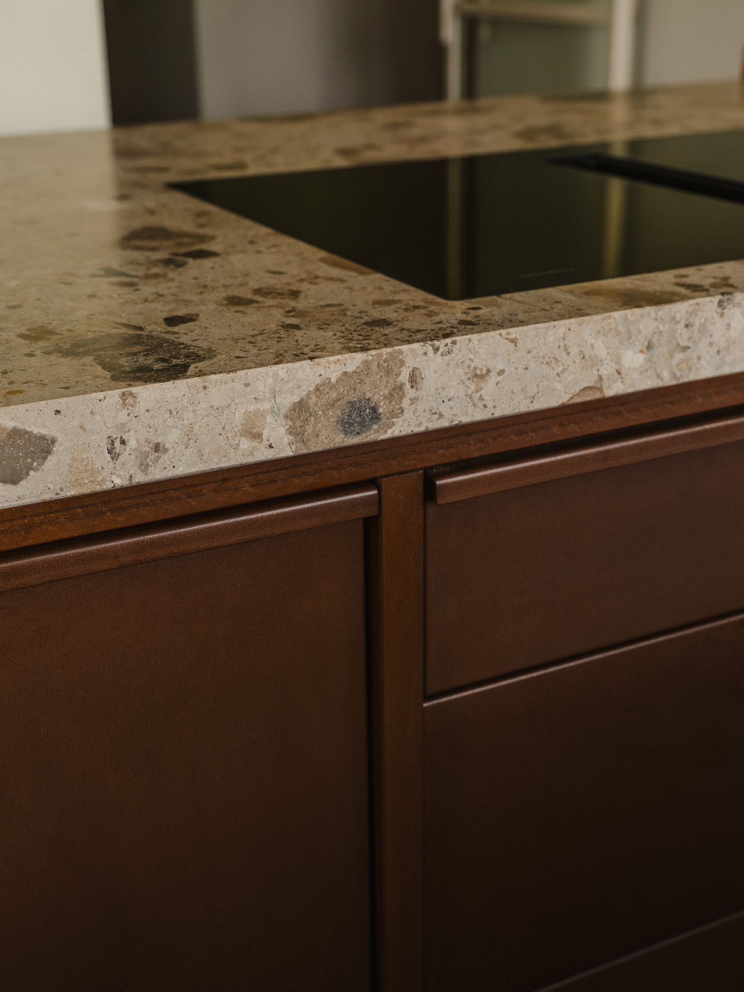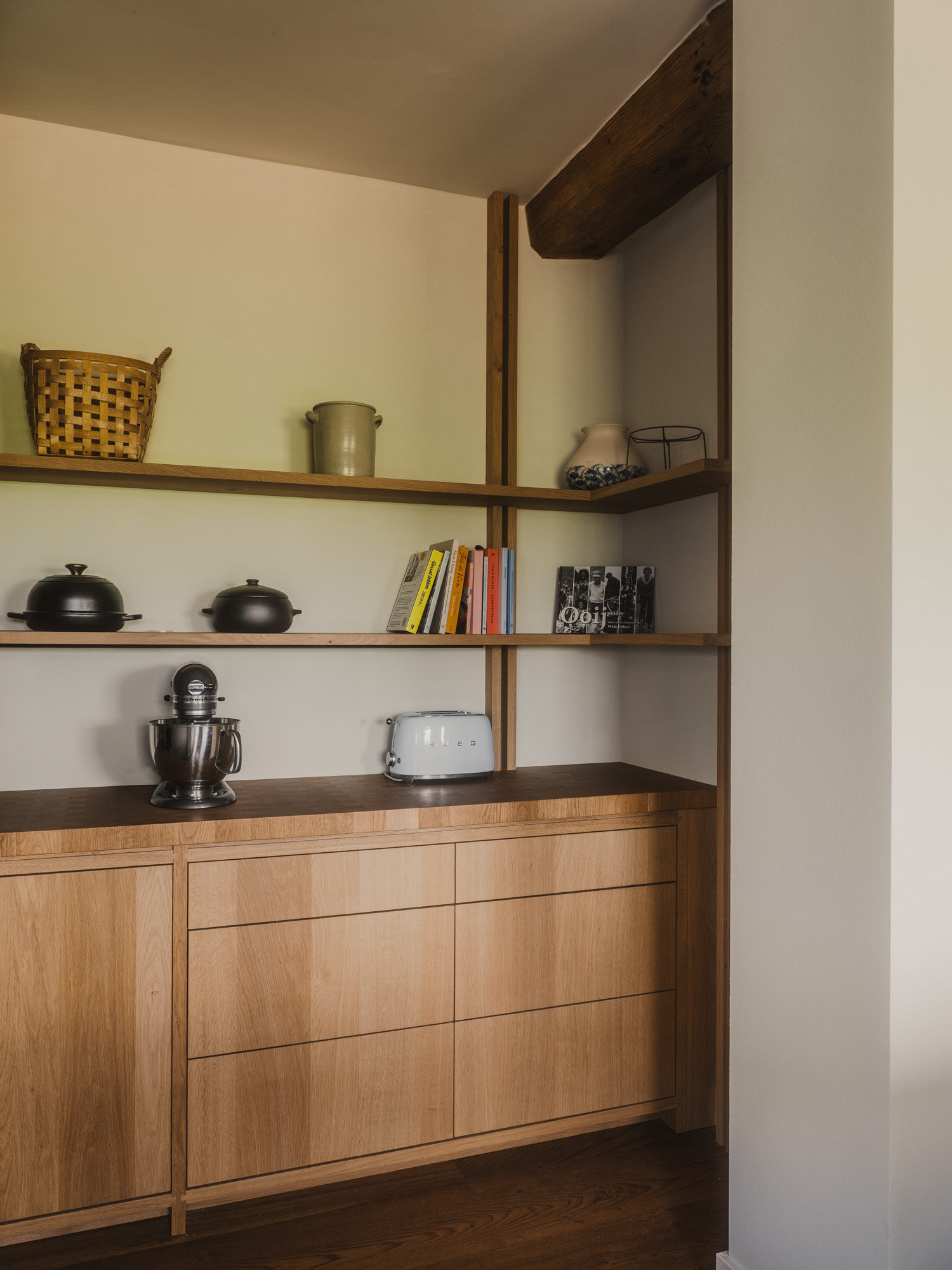 Rooted in rural inspiration, this kitchen brings together varied wood textures: a curated interplay of tone, grain and warmth. A full marble sink, precisely centered beneath the window, frames the landscape and allows the natural view to become part of the daily ritual. Soft daylight flows in, giving the space a gentle, inviting look, while the muted tones of the kitchen blend seamlessly with the calm colors of the home. Designed with both beauty and function in mind, it offers generous storage throughout, anchored by a spacious cabinet that adds capacity without disturbing the open, airy character. Subtle details and honest materials, thoughtfully composed, anchor this rural kitchen as a place both warm and practical.