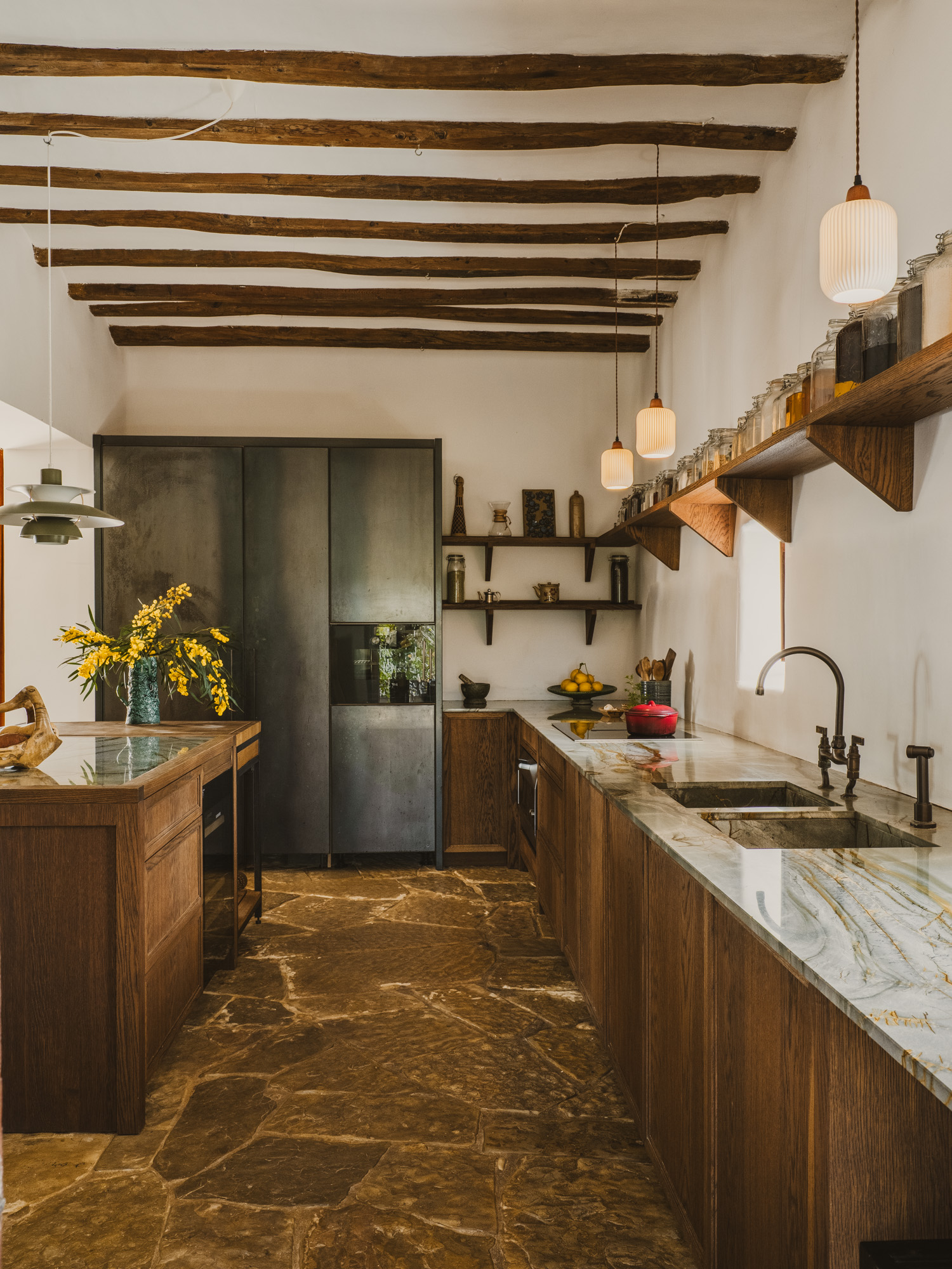 The original wooden beams were the starting point for the design, warm, rural, and full of character.
